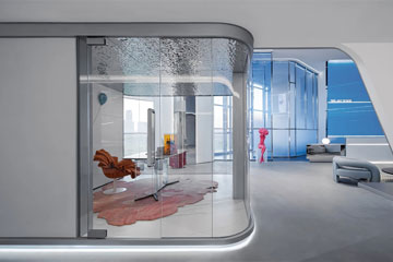 本案为网红直播办公室装修设计,门厅以修长的的线条和透明材质为主要设计元素打造轻盈第一感,结合舒适的沙发给人时尚高级的视觉感受。极具质感的铝板形成的曲面可以说是点睛之处,实现迎宾与引导视线沿空间延伸的双重功能。 接待台形式上打破制式分隔空间的惯性,室内让出更自由的平面,少量而形体利落的立面延续几何语汇。为了加强空间的独立......
