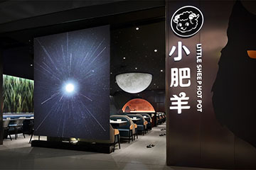 首先映入眼帘的是门头狼和橘色狼眼的剪影,与投影屏幕上的星空遥相呼应,展现夜幕降临时草原的大气景象,不经意间把客人吸进了空间故事。跟着狼的脚步走进餐厅,意味着夜空的天花板上有星星,满月挂在空中,瞬间给人一种开阔的感觉,走进星夜草原世界只有几步之遥。...